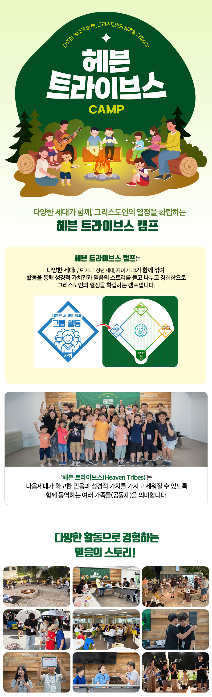 1. 헤븐 트라이브스 캠프는 다양한 세대가 함께 섞여 활동하는 캠프입니다.