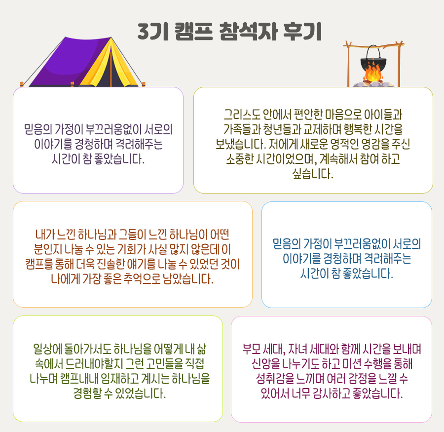 1) 캠프의 철학과 목적에 따라 가족이 함께 등록해도 가족 별로 활동하지 않습니다.