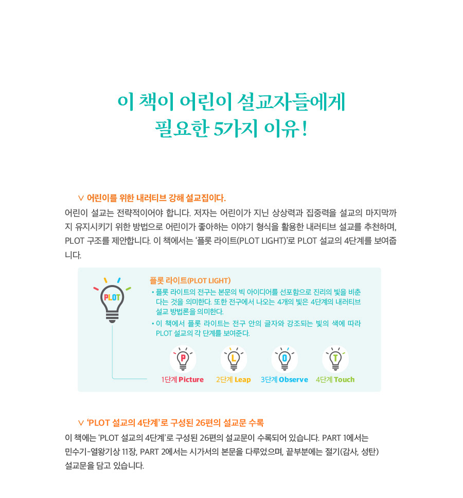 저자는 ‘이야기의 힘’을 활용한 내러티브 형식의 어린이 설교가 어린이들에게 효과적으로 전달될 수 있다고 말하며, 4단계의 ‘PLOT 설교’를 제시합니다.