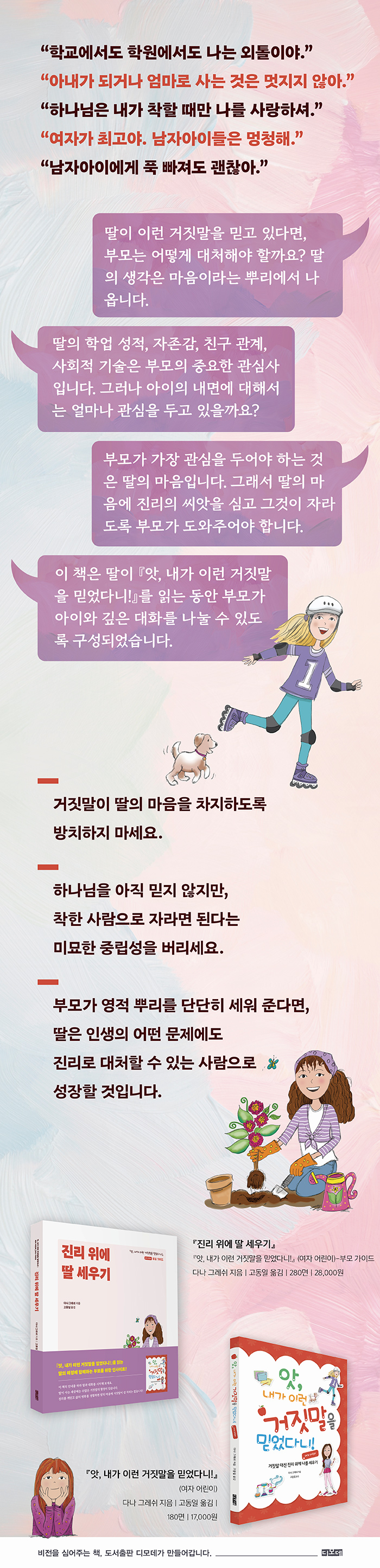 이 책은 진리를 탐구하는 딸의 여정에 함께하는 동안 부모의 인식에 대전환을 일으킬 것입니다. 세상 가치관에 편승해 아이가 물질과 특권을 더 원하는 것을 방치했음을 인정하고, 진리와 거짓의 싸움에 뛰어들겠다고 결심하게 할 것입니다. 딸의 마음에 집중하세요. 딸의 신념과 가치관이 진리에 뿌리내리도록 도와주세요. 그럴 때 우리 딸들은 참된 자유와 기쁨을 누리며, 어떤 문제에도 진리로 대처할 수 있는 사람으로 성장할 것입니다.