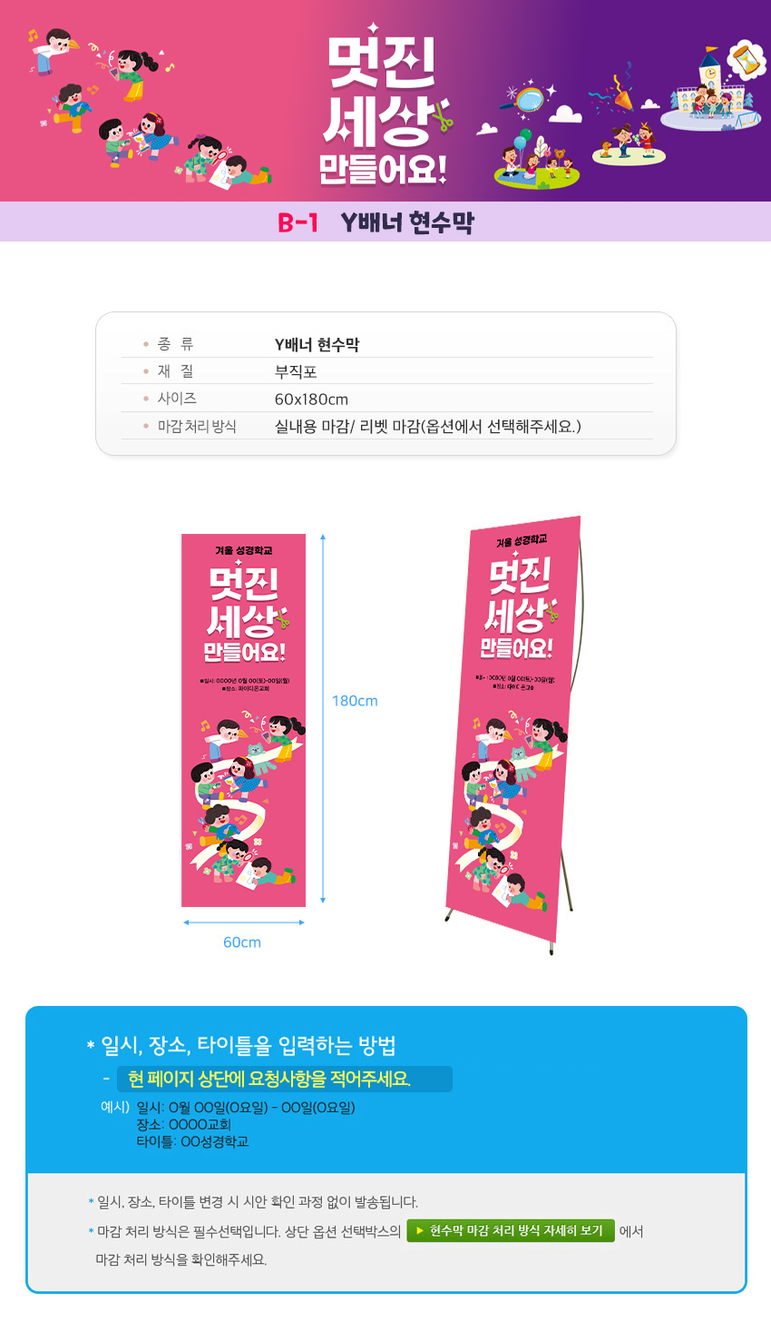 가로형, 배너형, 교회 일정 홍보형 현수막 상품을 구매하시면 됩니다.